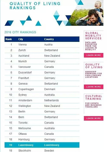 (卢森堡市在2016年全球最宜居城市排名第十九,图片来自Mercer网站)