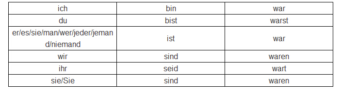 这里补充一下系动词 sein 的现在时和过去式动词变位: