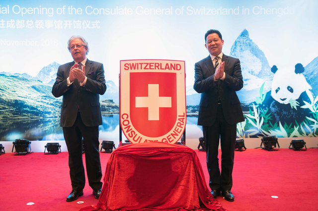 11月30日,瑞士驻成都总领事馆在四川成都举行开馆仪式,该馆领区范围涵盖中国西南地区的四川省、贵州省、云南省和重庆市。这是瑞士在中国除驻华使馆,瑞士驻上海、广州和香港总领事馆之后的第五个官方代表机构。